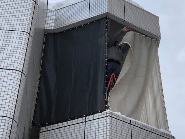 今日からスタジオビルの修繕として、外階段の防風雪ネットの交換を始めました♫