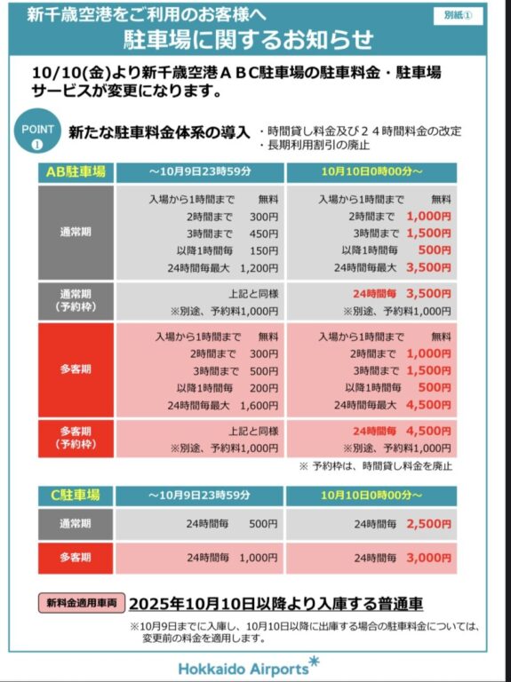 来月から始められる、千歳空港駐車場の料金改定のご案内です