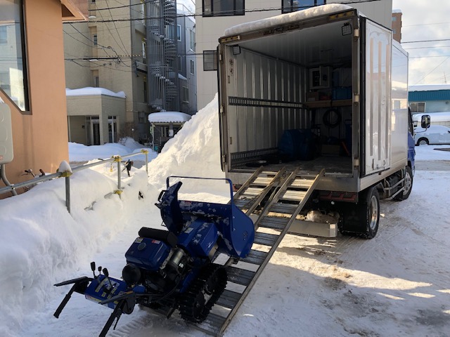 トラックで来たと思ったら、ウインチで除雪機を引き上げ、トラックの中で治療です!!!
